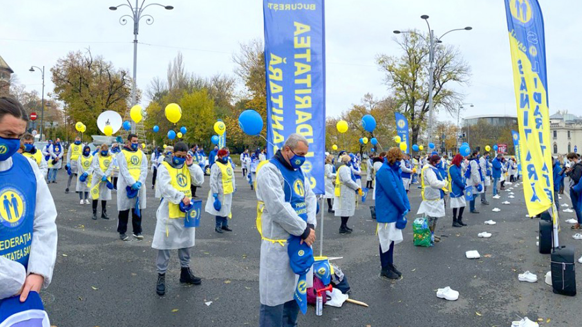 Румынская Федерация медработников «Санитарная солидарность» организовала протест перед Парламентом Румынии с требованиями улучшения мер социальной защиты сотрудников медучреждений.